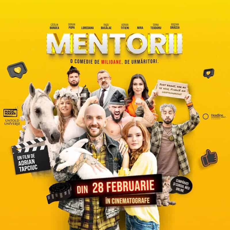 The colorful poster promotes the Romanian comedy film “Mentorii” by Adrian Tapciu, highlighting its cheerful theme and cast members.